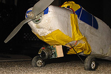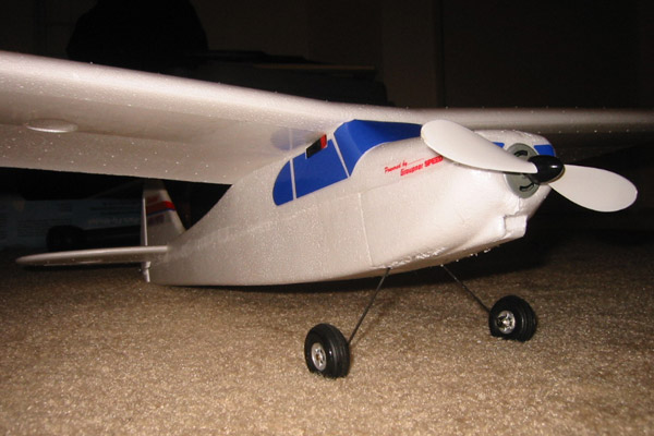 Graupner Mini Piper:The Mini Piper is an expanded polystyrene model airplane. With a 30" wingspan, it has a wing area of approximately 166 square inches. This design does not offer much cargo capacity margin. Through the use high-end electronics (typically used on models much more complex and expensive than this) the weight has been kept down. Even though the plane was built in a stock configuration, some deviations were made to ensure a good power to weight ratio. Namely: The rest of the hardware: With the addition of a video camera system, the Mini Piper has been converted from a standard trainer into a valuable asset in the pursuit of information gathering.